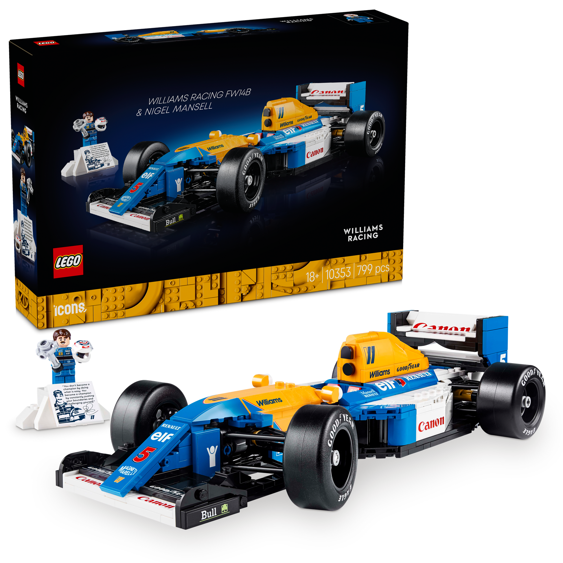 - Collectible race car building set for adults – Celebrate historic F1® innovation with this LEGO® Icons Williams Racing FW14B & Nigel Mansell building set for fans of motorsports and legendary vehicles