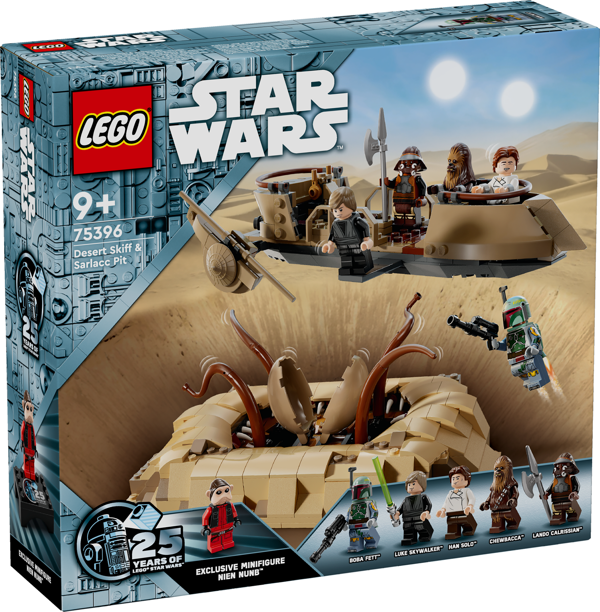 Wüsten-Skiff und Sarlacc-Grube (75396) ist ein faszinierendes Star Wars Bau- und Spielset für Kinder ab 9 Jahren. Fans können mit den Modellen aus LEGO Steinen eine spannende Szene aus Star Wars: Die Rückkehr der Jedi-Ritter nachspielen oder eigene Abenteuergeschichten darstellen. Durchsichtige Elemente erwecken den Eindruck, das Wüsten-Skiff würde schweben. Außerdem kann man eine Planke herausschieben, über die Luke Skywalker gehen muss. Und auch die „brüchige“ Reling, die Han Solo fast zum Verhängnis geworden wäre, darf nicht fehlen. An der Grube befinden sich Hebel, um die Tentakeln des Sarlaccs zu bewegen, in dessen Maul eine LEGO Minifigur passt. Dieses Bauspielzeug zum Bauen und Sammeln ist ein tolles Geschenk für Jungen, Mädchen und alle Fans der klassischen Star Wars Trilogie. Das Fantasy-Set beinhaltet 6 LEGO Minifiguren mit authentischem Zubehör, darunter auch Luke Skywalker, Han Solo, Chewbacca, Lando Calrissian und Boba Fett. Die sechste LEGO Star Wars Minifigur stellt Nien Nunb dar, der zur Feier des 25-jährigen LEGO Star Wars Jubiläums exklusiv in diesem Abenteuer-Set enthalten ist. Schritt-für-Schritt-Anleitungen findest du nicht nur in der Box, sondern auch in der LEGO Builder App. Funktionen zum Betrachten digitaler Modellansichten sorgen für ein noch faszinierendes kreatives Erlebnis.